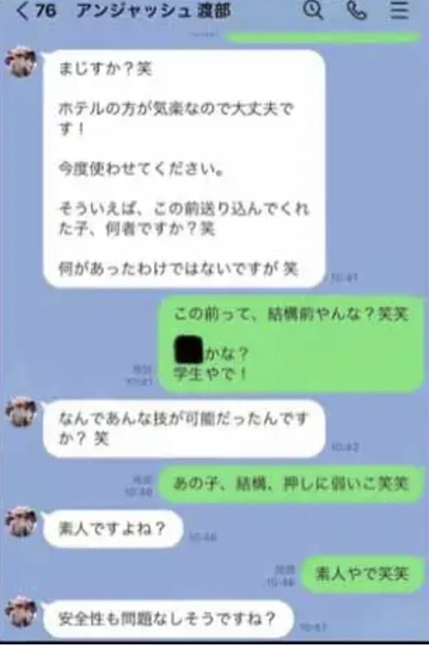 東谷は、渡部とのLINEのやり取りを保存しているといい、動画の最後ではスクリーンショットを公開。そこでは「この前送り込んでくれた子、何者ですか?」「なんであんな技が可能だったんですか?」といった会話も見られます。